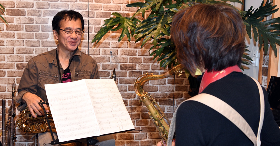 音楽は心と体のスポーツです。感性を磨き、若さを保ちます。生徒のレベルとペースに合わせ、きめ細やかなレッスンを行います。生徒一人一人にオーダーメイドのレッスンを展開します。たとえば初心者にはなじみのある一曲をマスターすることから始めます。楽譜が読めなくても大丈夫。一曲を集中して練習する過程で基本的な奏法(アンブッシャー、タンギング、フィンガリング、呼吸法etc.)を自然にマスターしていく・・・といった具合です。それも楽しく!もちろん経験者には国内、外の教則本、エチュード、※オリジナル教材、オリジナルマイナスワン教材、国内、外のマイナスワン教材、自動伴奏ソフト・・・と最新のオーディオ環境を駆使してレッスンを行います。また発表会、ライブ、コンサートに参加していただきます。